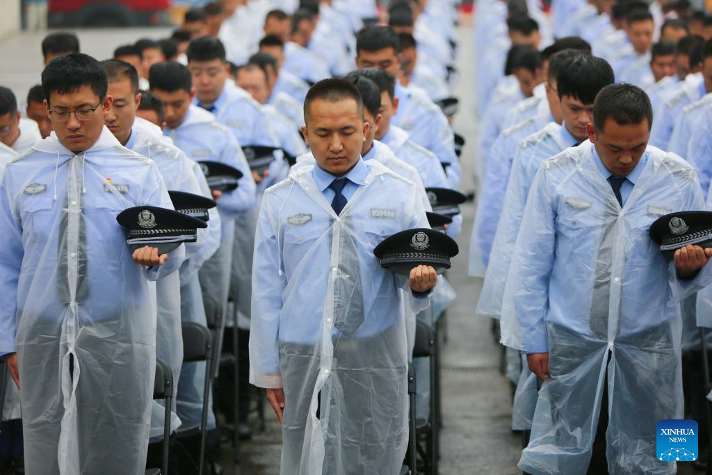 People participate in an event to commemorate the 92nd anniversary of the September 18 Incident at the square of the Exhibition Hall of Evidence of Crime Committed by Unit 731 of the Japanese Imperial Army in Harbin, northeast China's Heilongjiang Province, Sept. 18, 2023.