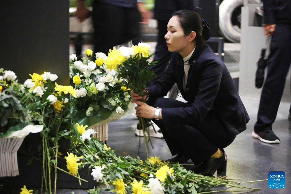 A staff member arranges flowers at the Exhibition Hall of Evidence of Crime Committed by Unit 731 of the Japanese Imperial Army in Harbin, northeast China's Heilongjiang Province, Sept. 18, 2023.