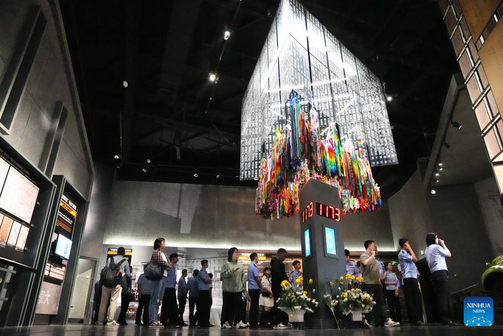 People strike the Bell of Peace at the Memorial Hall of the Victims in Nanjing Massacre by Japanese Invaders in Nanjing, east China's Jiangsu Province, Sept. 18, 2023.