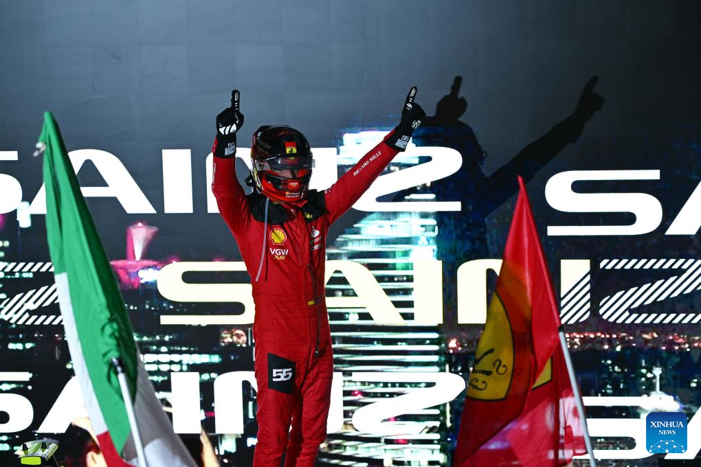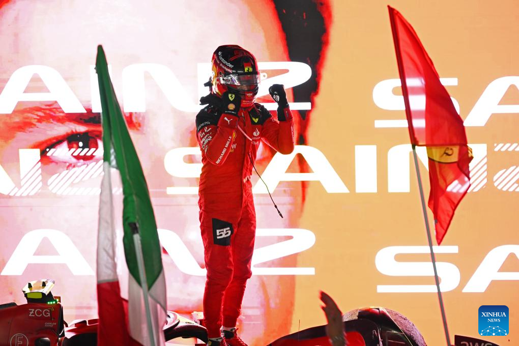 Ferrari driver Carlos Sainz of Spain celebrates on the podium after winning the Formula One Singapore Grand Prix Night Race at the Marina Bay Street Circuit, Sept. 17, 2023. (Photo by Then Chih Wey/Xinhua)