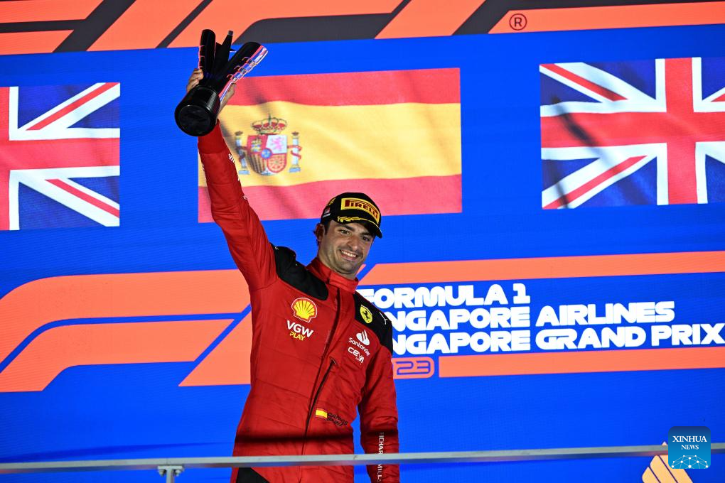 Ferrari driver Carlos Sainz of Spain celebrates with the trophy after winning the Formula One Singapore Grand Prix Night Race at the Marina Bay Street Circuit, Sept. 17, 2023. (Photo by Then Chih Wey/Xinhua)