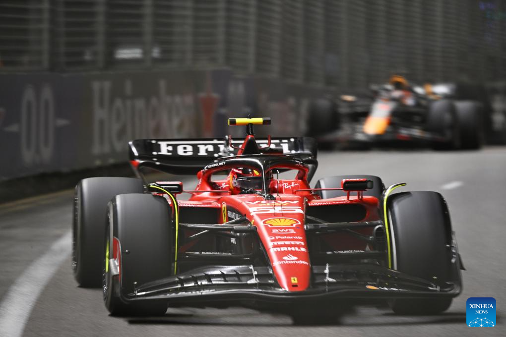 Ferrari driver Carlos Sainz of Spain races during the Formula One Singapore Grand Prix Night Race at the Marina Bay Street Circuit, Sept. 17, 2023. (Photo by Then Chih Wey/Xinhua)