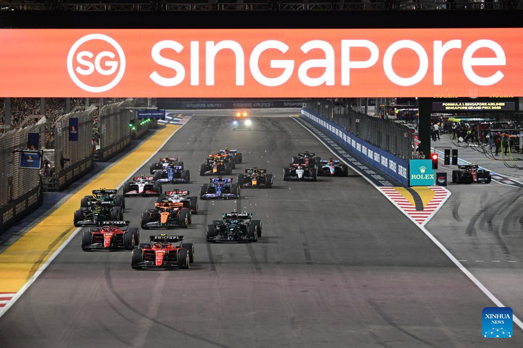 Ferrari driver Carlos Sainz (Front) of Spain races at the start of the Formula One Singapore Grand Prix Night Race at the Marina Bay Street Circuit, Sept. 17, 2023. (Photo by Then Chih Wey/Xinhua)
