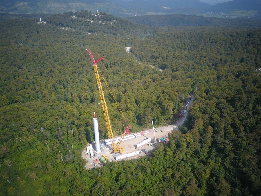 Photo taken on Sept. 16, 2020 shows the lifting operation at the construction site of the Senj Wind Farm project in Senj, Croatia. (Xinhua/Gao Lei)