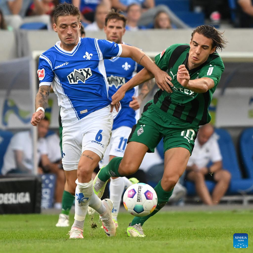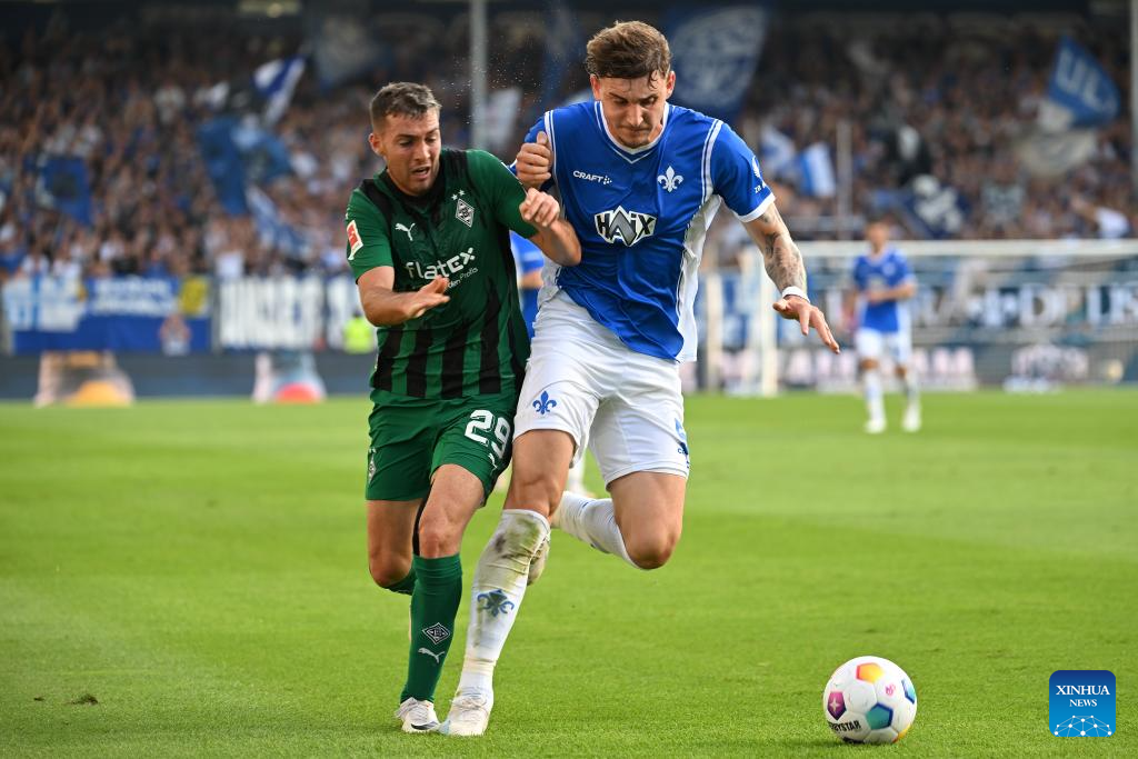Bartol Franjic (L) of SV Darmstadt 98 vies with Robin Hack of Borussia Moenchengladbach during the first division of bundesliga 4th round match between SV Darmstadt 98 and Borussia Moenchengladbach in Darmstadt, Germany, Sept. 17, 2023. (Photo by Ulrich Hufnagel/Xinhua)