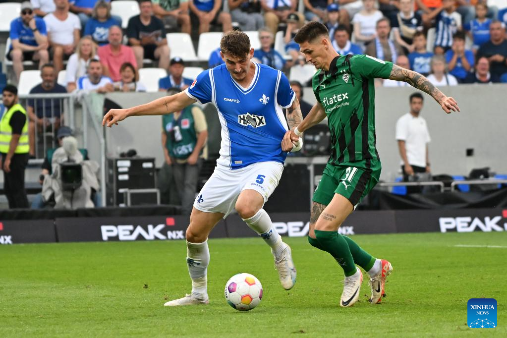 Matej Maglica (R) of SV Darmstadt 98 vies with Joseph Michael Scally of Borussia Moenchengladbach during the first division of bundesliga 4th round match between SV Darmstadt 98 and Borussia Moenchengladbach in Darmstadt, Germany, Sept. 17, 2023. (Photo by Ulrich Hufnagel/Xinhua)