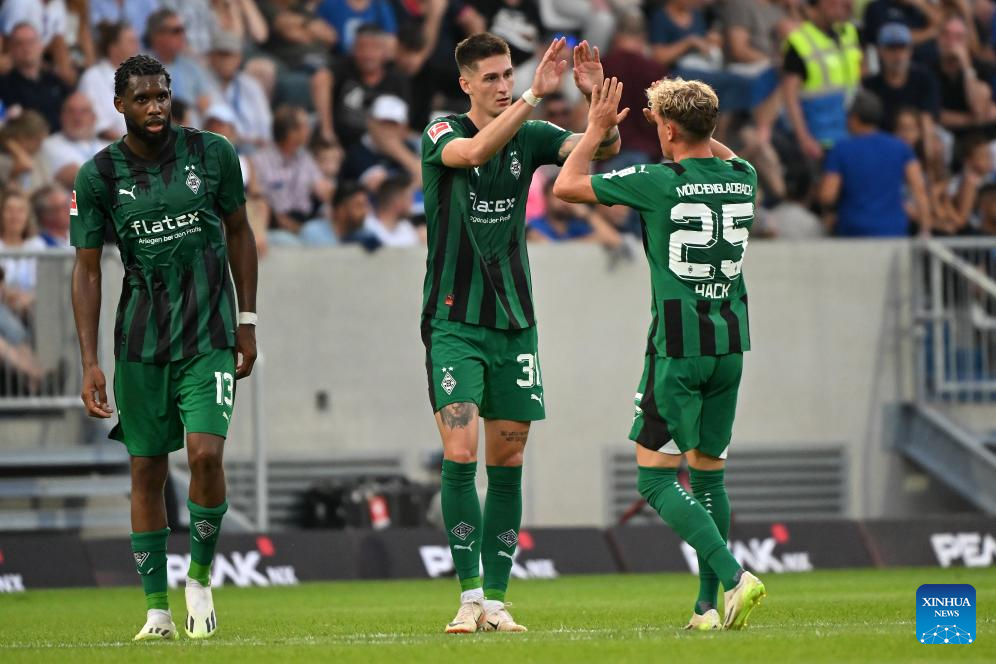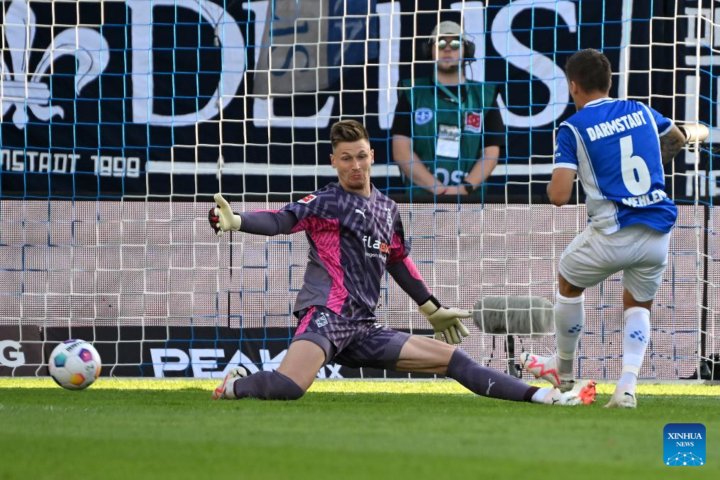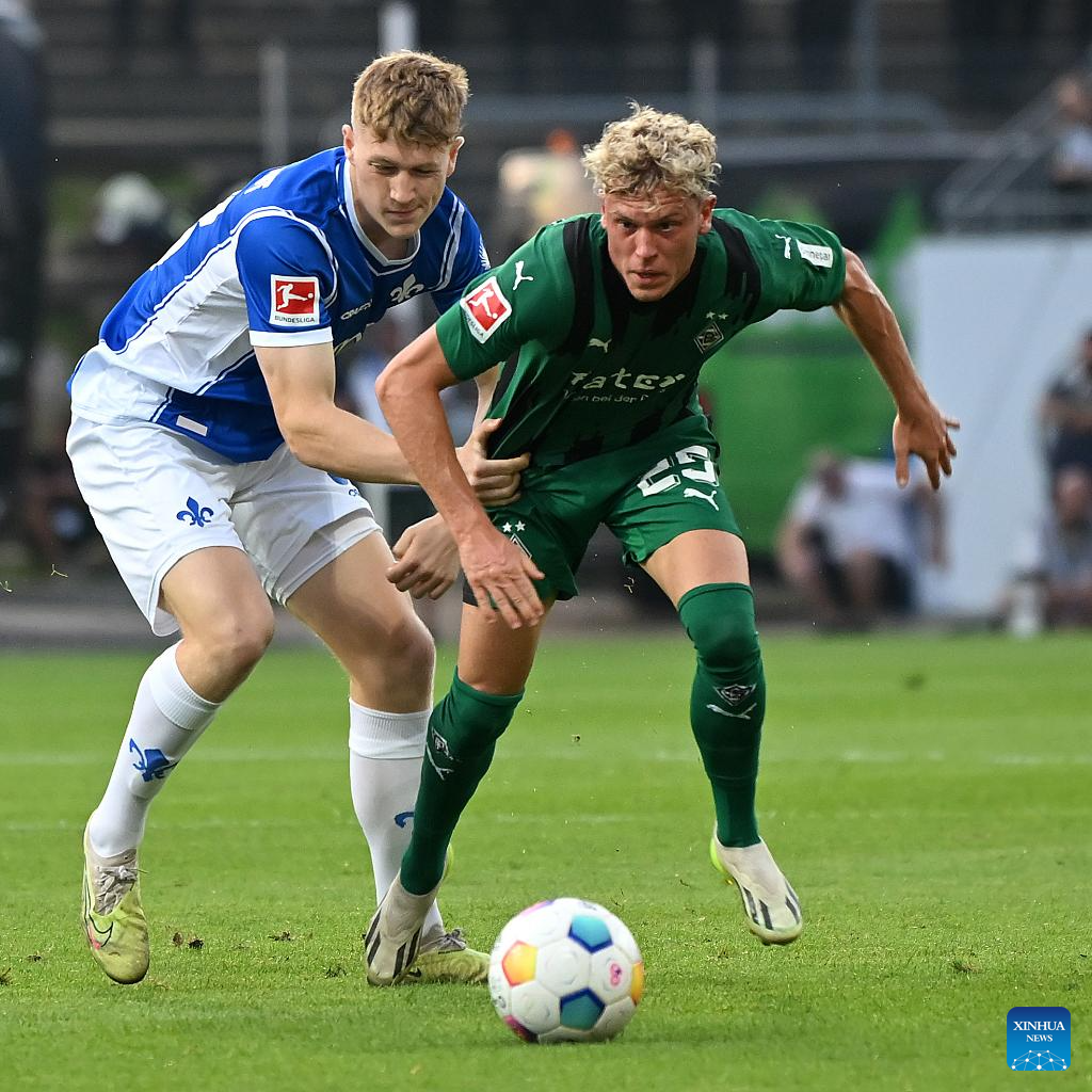 Tomas Cvancara (C) of Borussia Moenchengladbach celebrates after scoring during the first division of bundesliga 4th round match between SV Darmstadt 98 and Borussia Moenchengladbach in Darmstadt, Germany, Sept. 17, 2023. (Photo by Ulrich Hufnagel/Xinhua)