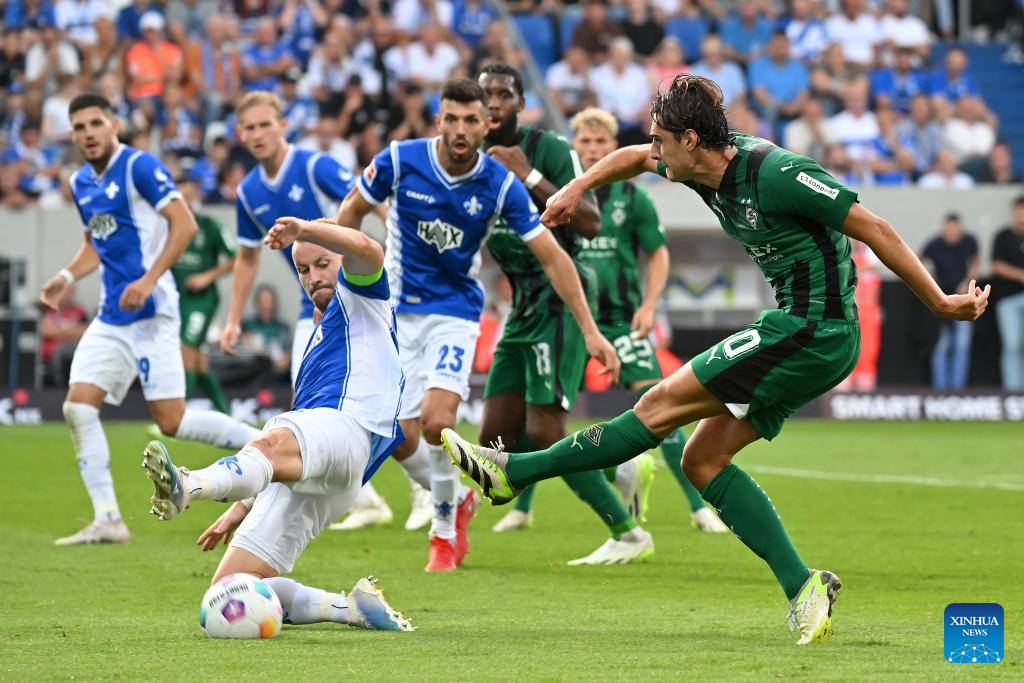 Marvin Mehlem (R) of SV Darmstadt 98 shoots to score during the first division of bundesliga 4th round match between SV Darmstadt 98 and Borussia Moenchengladbach in Darmstadt, Germany, Sept. 17, 2023. (Photo by Ulrich Hufnagel/Xinhua)