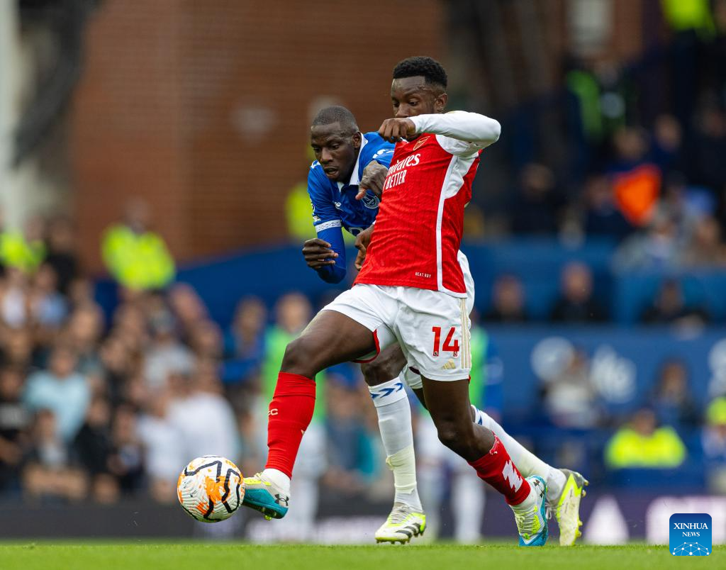 Arsenal's Eddie Nketiah (R) is challenged by Everton's Abdoulaye Doucoure during an English Premier League match between Everton and Arsenal in Liverpool, Britain, on Sept. 17, 2023. (Xinhua)