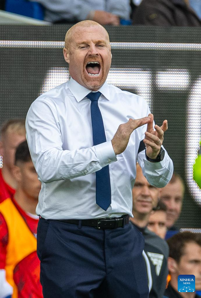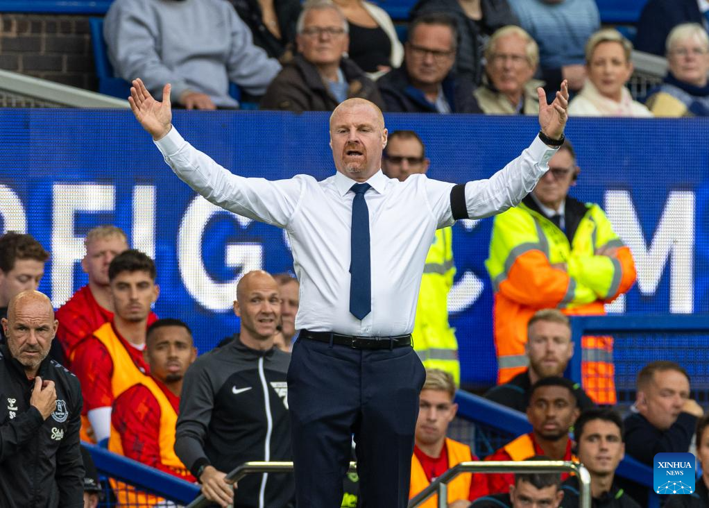 Everton's head coach Sean Dyche reacts during an English Premier League match between Everton and Arsenal in Liverpool, Britain, on Sept. 17, 2023. (Xinhua)