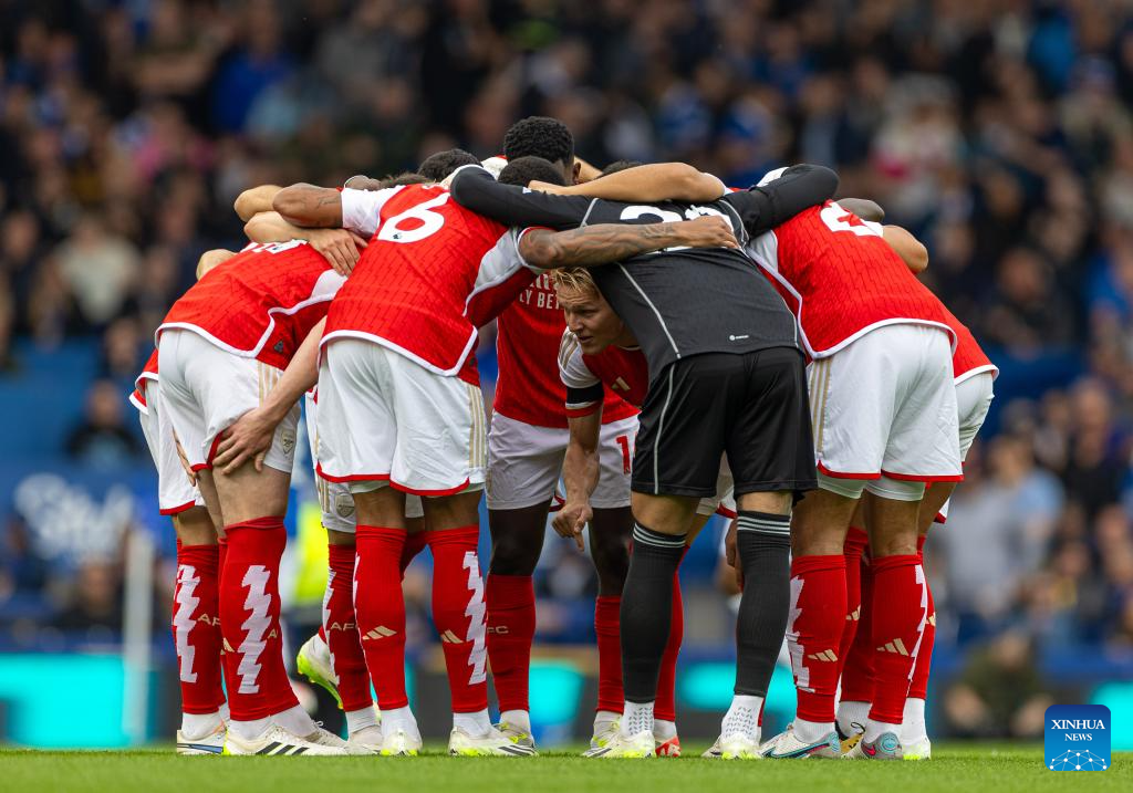 Arsenal's captain Martin Odegaard gives a pre-match team-talk to his players before an English Premier League match between Everton and Arsenal in Liverpool, Britain, on Sept. 17, 2023. (Xinhua)