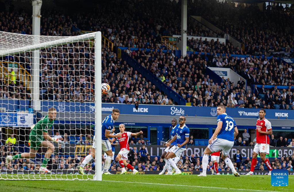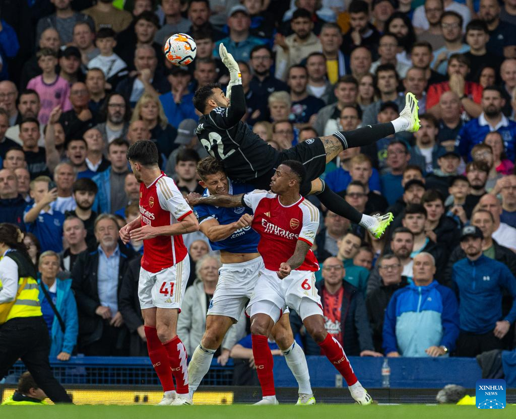 Arsenal's goalkeeper David Raya (top) is sent flying during an English Premier League match between Everton and Arsenal in Liverpool, Britain, on Sept. 17, 2023. (Xinhua)