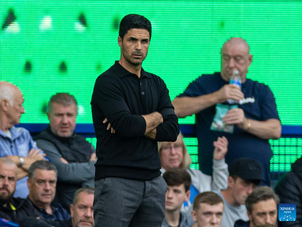 Arsenal's head coach Mikel Arteta reacts during an English Premier League match between Everton and Arsenal in Liverpool, Britain, on Sept. 17, 2023. (Xinhua)