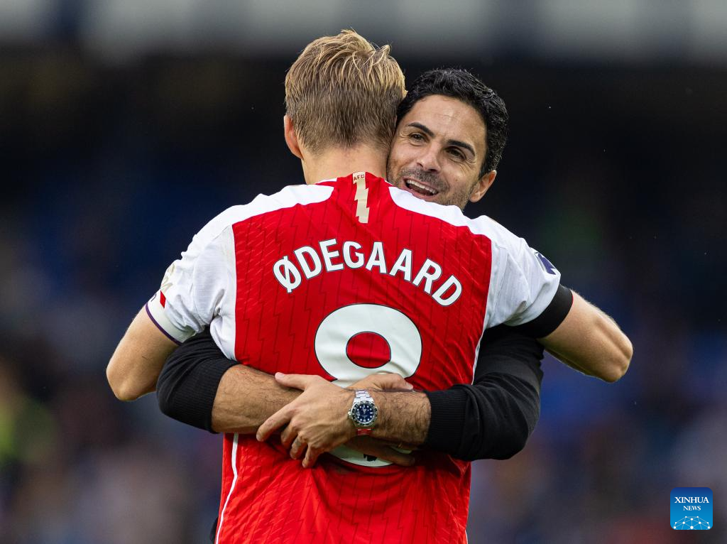 Arsenal's head coach Mikel Arteta (R) celebrates with captain Martin odegaard after an English Premier League match between Everton and Arsenal in Liverpool, Britain, on Sept. 17, 2023. (Xinhua)