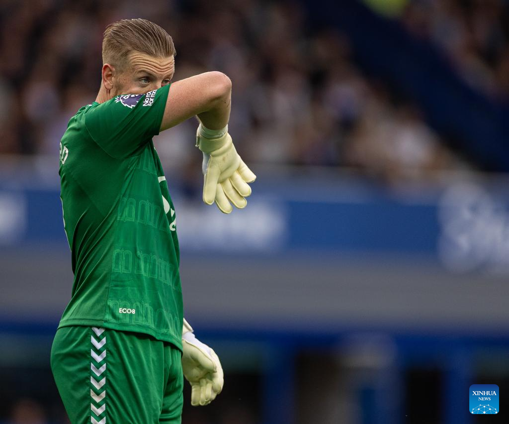 Everton's goalkeeper Jordan Pickford reacts during an English Premier League match between Everton and Arsenal in Liverpool, Britain, on Sept. 17, 2023. (Xinhua)