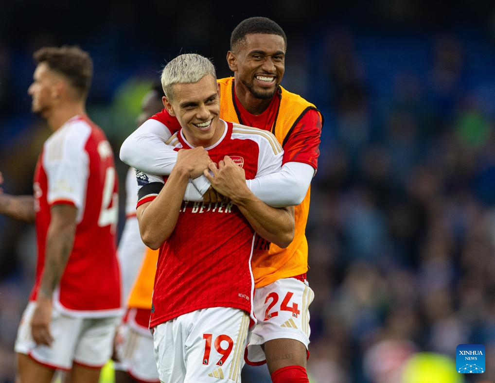 Arsenal's goal-scorer Leandro Trossard (L) celebrates with teammate Reiss Nelson after an English Premier League match between Everton and Arsenal in Liverpool, Britain, on Sept. 17, 2023. (Xinhua)
