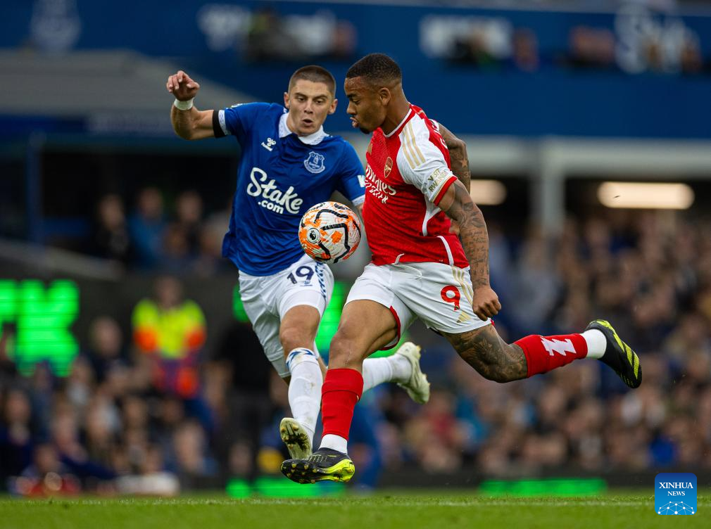 Arsenal's Gabriel Jesus (R) is challenged by Everton's Vitalii Mykolenko during an English Premier League match between Everton and Arsenal in Liverpool, Britain, on Sept. 17, 2023. (Xinhua)