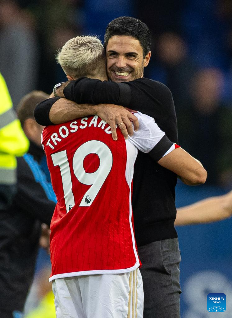 Arsenal's head coach Mikel Arteta (R) celebrates with goal-scorer Leandro Trossard after an English Premier League match between Everton and Arsenal in Liverpool, Britain, on Sept. 17, 2023. (Xinhua)