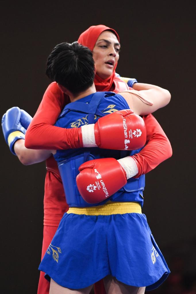 Shahrbanoo Mansourian (in red) hugs Cai Yingying of China after the women's 60kg sanda final at the Jakarta Asian Games, August 23, 2018. (Xinhua/Cheong Kam Ka)