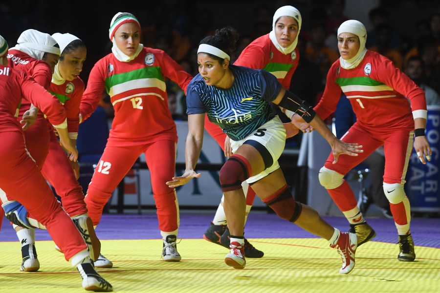Iranian athletes defend in the women's Kabaddi final against India at the Jakarta Asian Games, August 24, 2018. (Xinhua/Du Yu)
