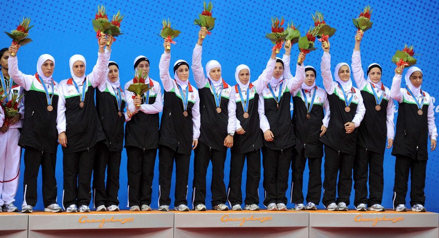 Team Iran took bronze in the women's Kabaddi at the Guangzhou Asian Games, Nov. 26, 2010. (Xinhua/Li Ga)