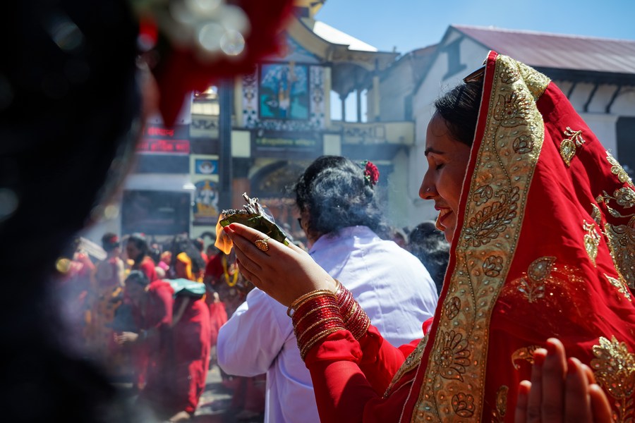 Women celebrate the Teej Festival at Pashupatinath Temple in Kathmandu, Nepal, Sept. 18, 2023. (Photo by Hari Maharjan/Xinhua)