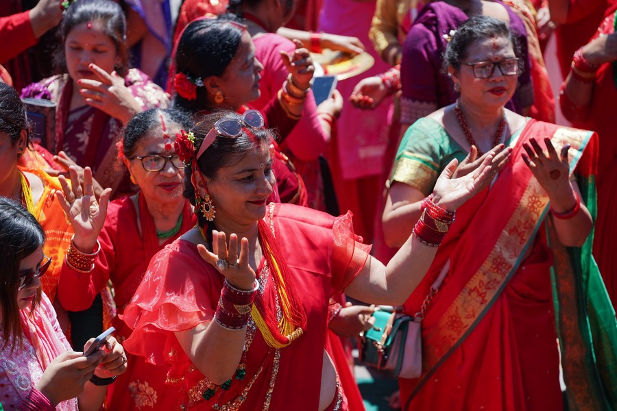 KATHMANDU, Sept. 19 (Xinhua) -- Nepali women celebrate the Teej Festival in Kathmandu on Sept. 18. The festival commemorates the reunion of Goddess Parvati and Lord Shiva, following the efforts of Parvati's female friend to help her unite with her beloved.