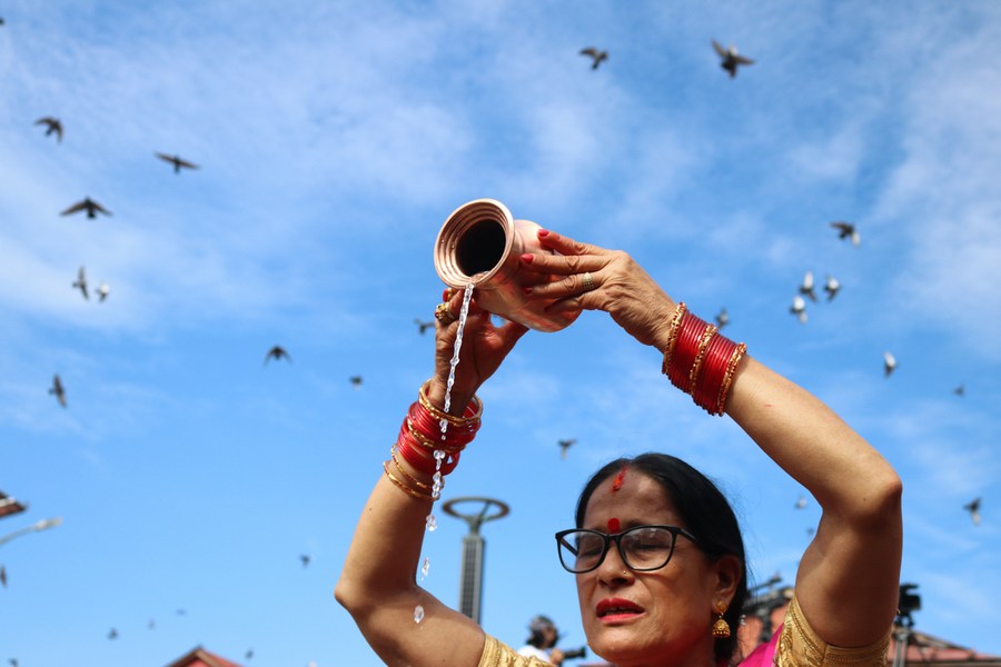 A woman offers prayers during the Teej Festival in Kathmandu, Nepal, Sept. 18, 2023. (Photo by Sulav Shrestha/Xinhua)■
