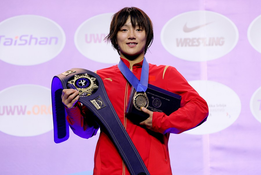 Zhang Qi poses for photos after winning the women's 59kg freestyle at the 2023 Wrestling World Championships in Belgrade, Serbia on Sept. 19, 2023. (Photo by Predrag Milosavljevic/Xinhua)