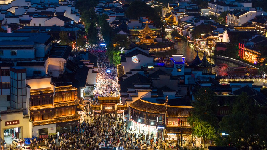This aerial photo taken on Aug. 17, 2023 shows a view of the Fuzi (Confucius) Temple scenic area in Nanjing, east China's Jiangsu Province. Qinhuai District of Nanjing has been boosting and diversifying its tourism economy in recent years through joint efforts in entertainment, sightseeing, catering and shopping services. (Xinhua/Li Bo)
