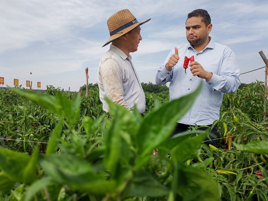 Pei Zhuoqiang, board chairman of an agricultural demonstration base, talks with Egyptian businessman Youssef Elkorma in a hot pepper field in Pingluo County, Shizuishan City, northwest China's Ningxia Hui Autonomous Region, Sept. 14, 2023. (Xinhua/Xie Jianwen)
