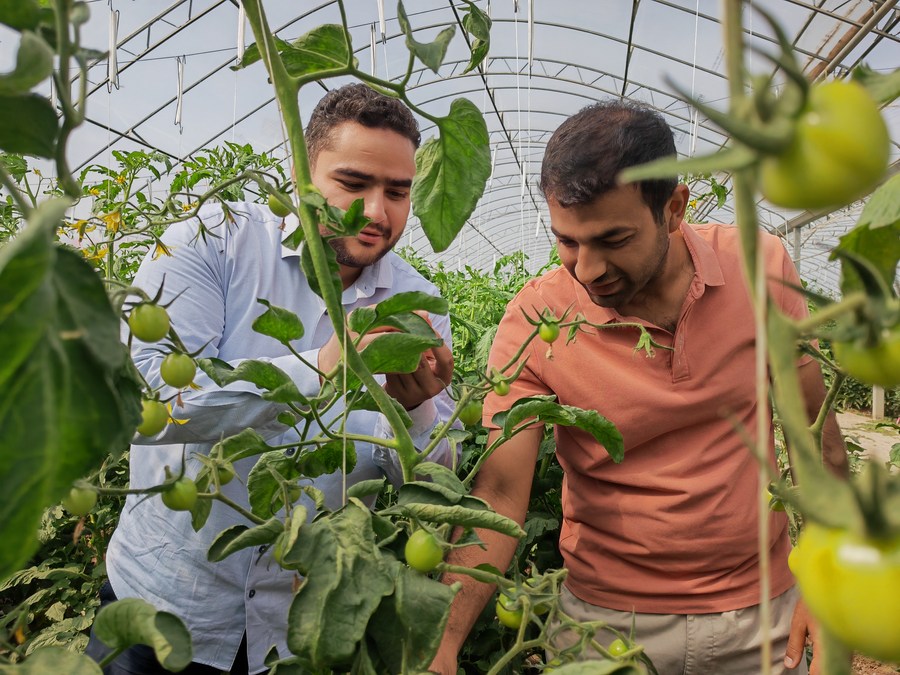 Mustafa Furkan Ozgener (R), a staff member from Türkiye, shows Egyptian businessman Youssef Elkorma around in a tomato greenhouse at an agricultural base in Pingluo County, Shizuishan City, northwest China's Ningxia Hui Autonomous Region, Sept. 14, 2023. (Xinhua/Xie Jianwen)