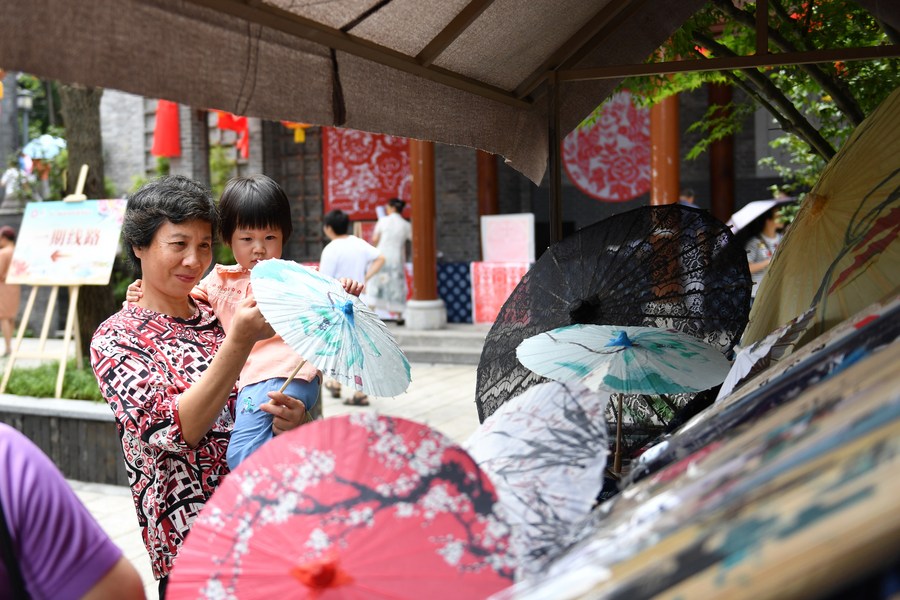 This photo taken on Sept. 16, 2023 shows visitors shop at the intangible cultural heritage exhibition held in Scroll Town in Suxian District of Chenzhou City, central China's Hunan Province. (Xinhua/Chen Zhenhai)