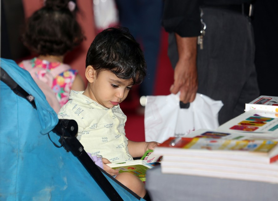 A child browses a book at the 24th edition of the Baghdad International Book Fair in Baghdad, Iraq, on Sept. 19, 2023. (Xinhua/Khalil Dawood)