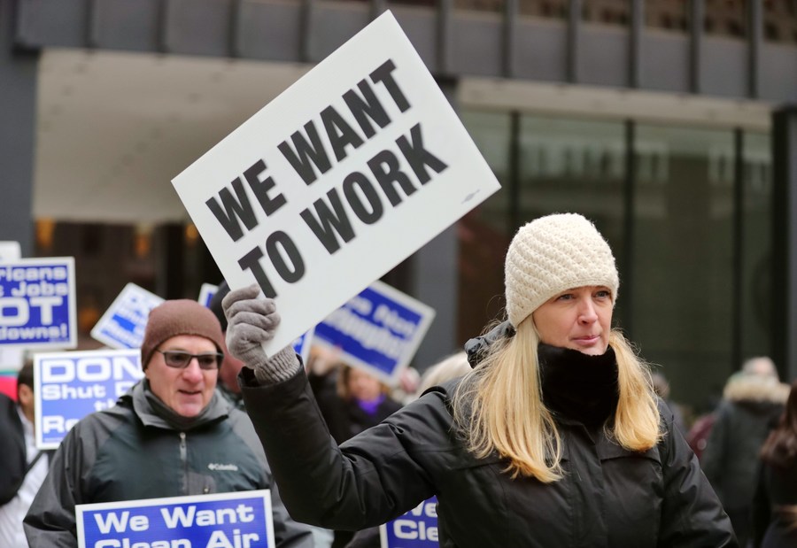 People hold placards during a rally to protest against the partial government shutdown at Federal Plaza in Chicago, the United States, on Jan. 18, 2019. (Xinhua/Wang Ping)