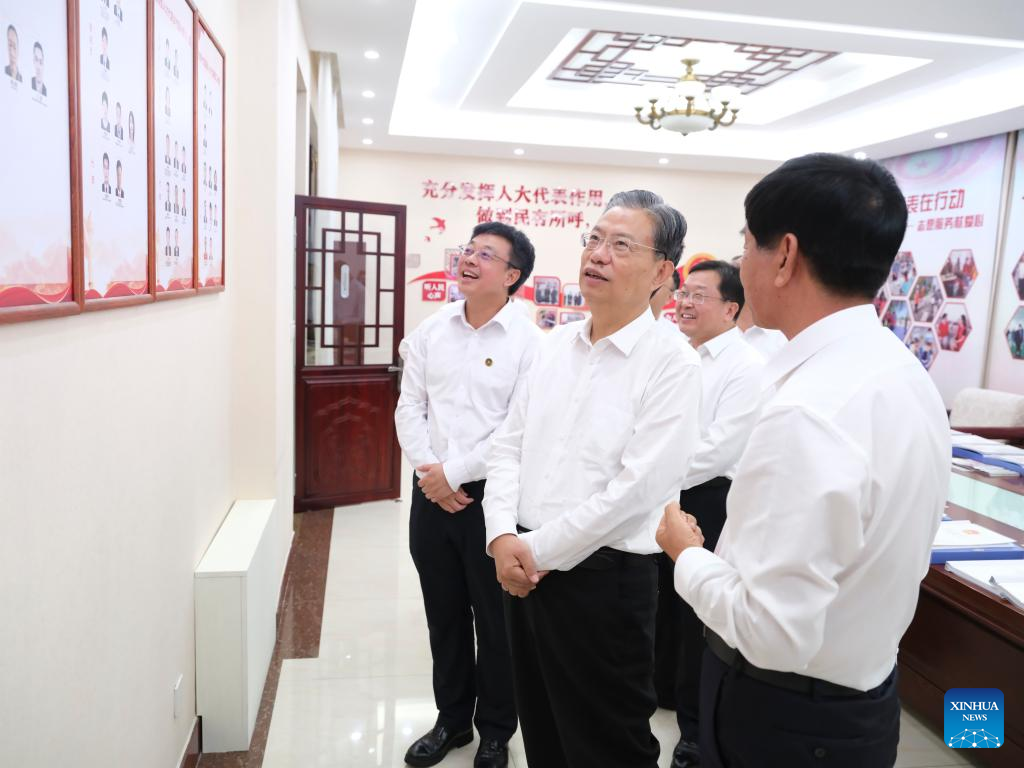 Zhao Leji, a member of the Standing Committee of the Political Bureau of the Communist Party of China Central Committee and chairman of the Standing Committee of the National People's Congress, visits a local legislators' liaison station in Qianquezhuang Village in Hanting District of Weifang City, east China's Shandong Province, Sept. 20, 2023. Zhao attended a local legislation seminar and carried out fact-finding research in east China's Shandong Province. (Xinhua/Ding Lin)