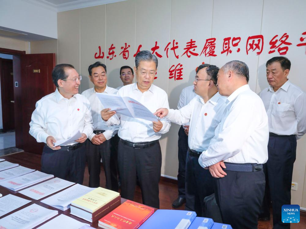 Zhao Leji, a member of the Standing Committee of the Political Bureau of the Communist Party of China Central Committee and chairman of the Standing Committee of the National People's Congress, visits Shandong's provincial people's congress standing committee in east China's Shandong Province, Sept. 19, 2023. Zhao attended a local legislation seminar and carried out fact-finding research in east China's Shandong Province. (Xinhua/Ding Lin)