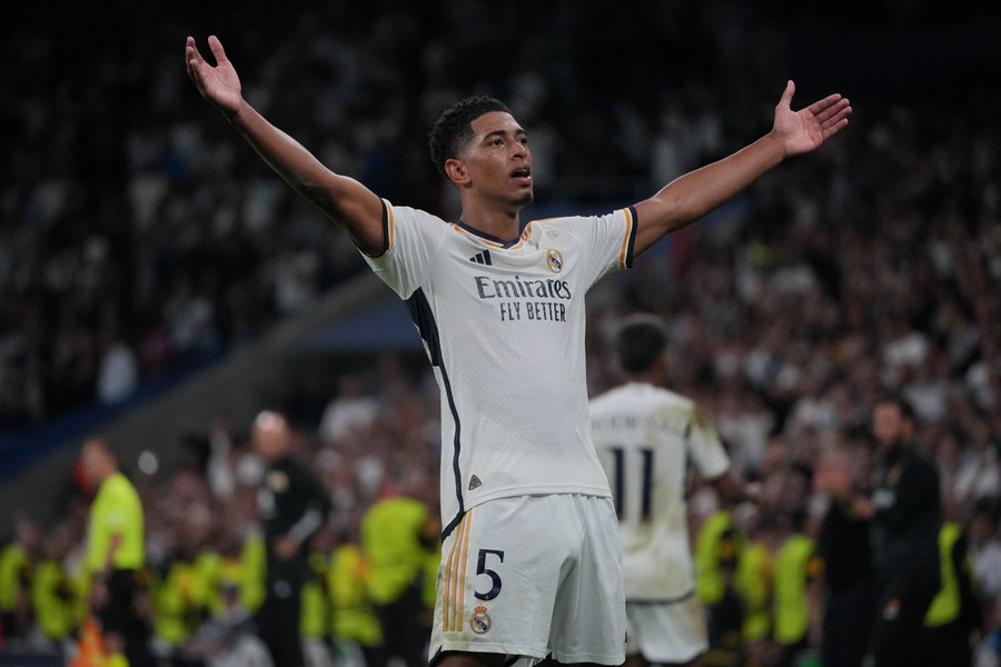 Jude Bellingham celebrates his winning goal during the UEFA Champions League Group C match against Union Berlin in Madrid, Spain, Sept. 20, 2023. (Photo by Yuheng Zhang/Xinhua)