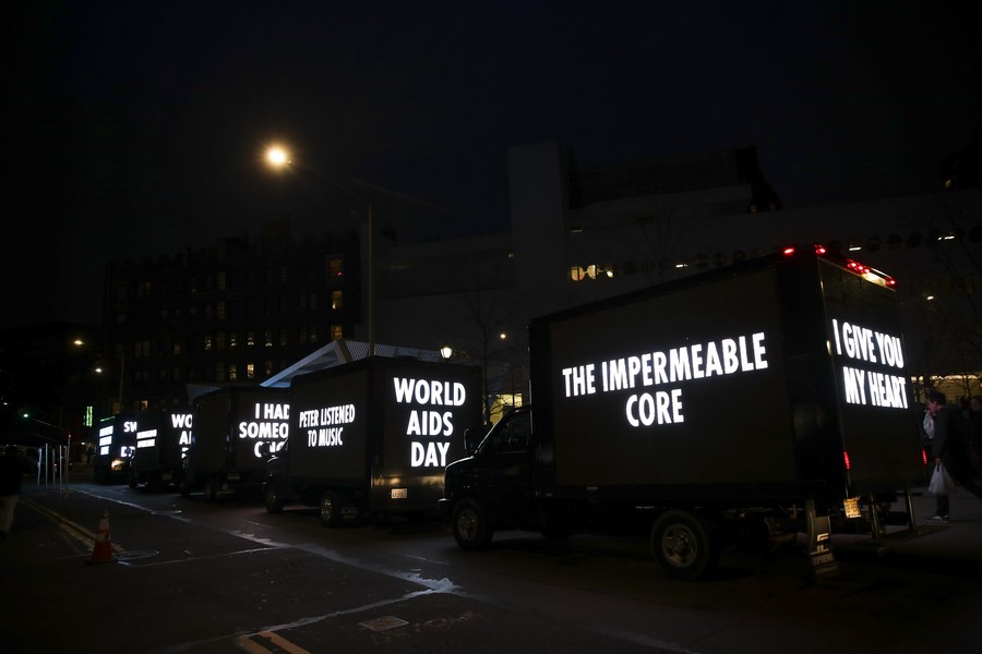 A fleet of five trucks emblazoned with LED signs are seen in a World AIDS Day memorial in New York, the United States, Dec. 1, 2018. (Xinhua/Wang Ying)