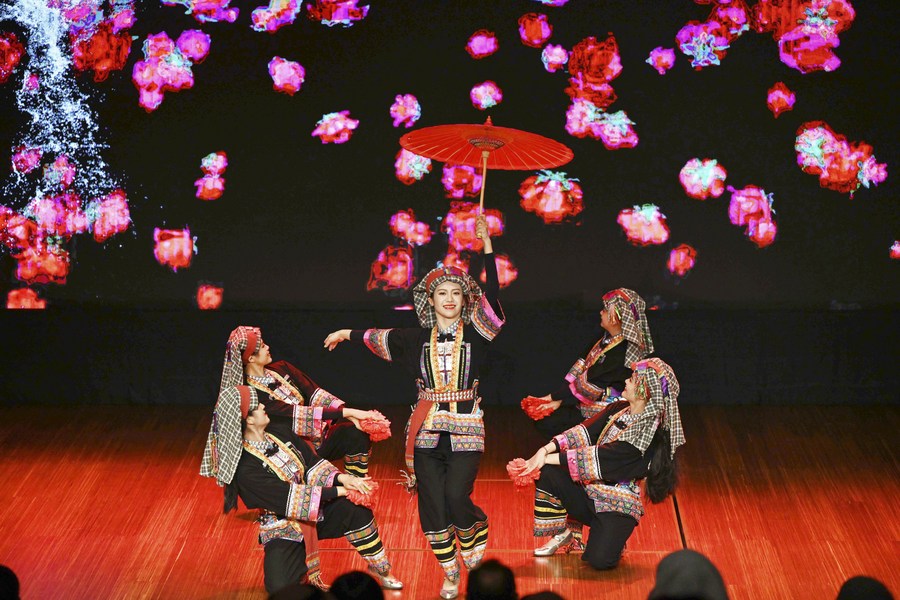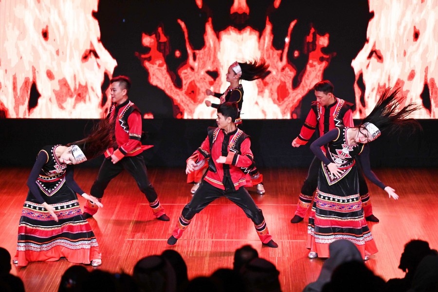 Chinese artists of an art troupe from Lincang City of southwest China's Yunnan Province perform in Capital Governorate, Kuwait, Sept. 19, 2023. The Kuwait Chinese Cultural Center held Tuesday its first show in Capital Governorate since its trial run. Chinese artists from Yunnan Province performed during the show, presenting the rich culture of ethnic minorities of Yunnan to the audience. (Photo by Asad/Xinhua)