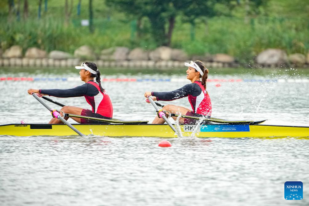 Wong Sheung Yee (R) and Hung Wing Yan Winne of China's Hong Kong compete during the Lightweight Women's Double Sculls Repechage of rowing at the 19th Asian Games in Hangzhou, east China's Zhejiang Province, Sept. 21, 2023. (Xinhua/Jiang Han)