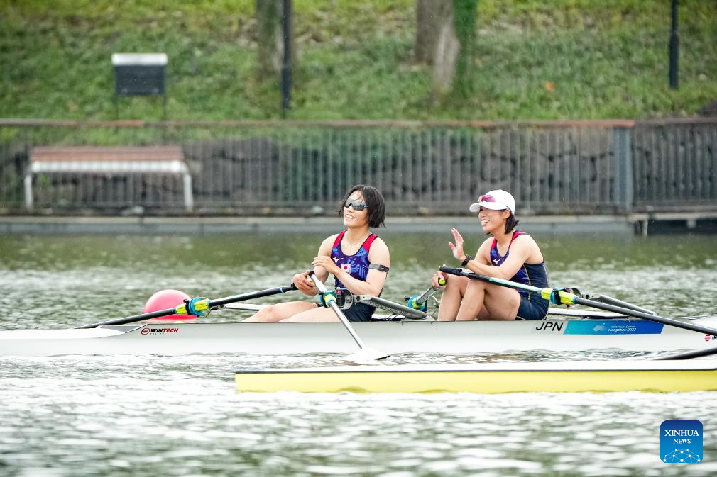 Kakishima Urara (R) and Hirouchi Emi of Japan react after the Lightweight Women's Double Sculls Repechage of rowing at the 19th Asian Games in Hangzhou, east China's Zhejiang Province, Sept. 21, 2023. (Xinhua/Jiang Han)