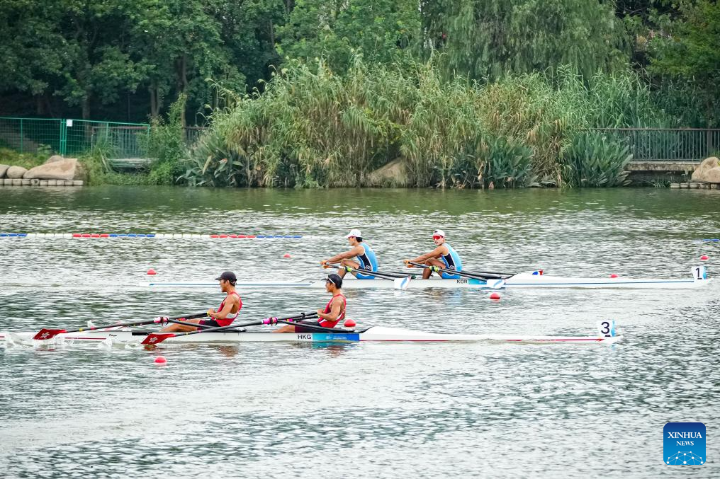 Chan Tik Lun (R, front) /Chan Chi Fung (L, front) of China's Hong Kong and Sim Hyunbo (R, rear)/Kang Jisu of South Korea compete during the Lightweight Men's Double Sculls Repechage of rowing at the 19th Asian Games in Hangzhou, east China's Zhejiang Province, Sept. 21, 2023. (Xinhua/Jiang Han)
