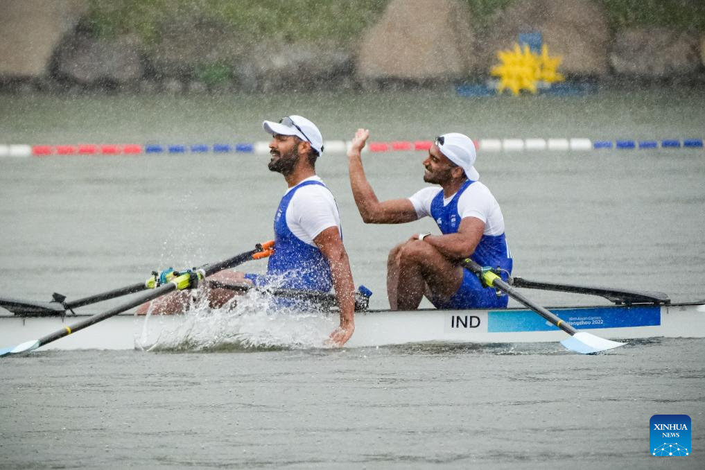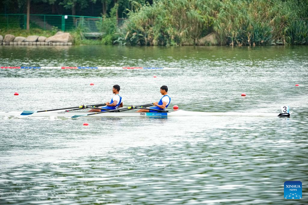 Arjun Lal Jat (R) and Arvind Singh of India compete during the Lightweight Men's Double Sculls Repechage of rowing at the 19th Asian Games in Hangzhou, east China's Zhejiang Province, Sept. 21, 2023. (Xinhua/Jiang Han)