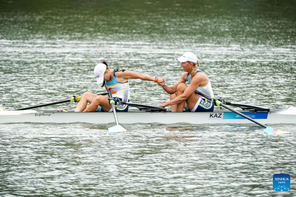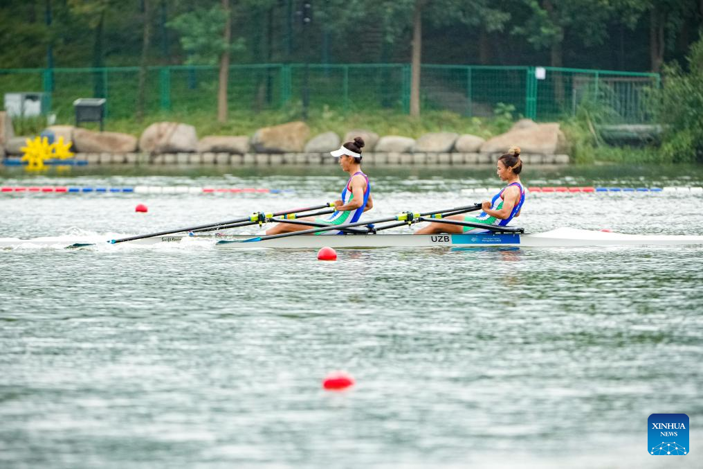 Luizakhon Islomova (R) and Malika Tagmatova of Uzbekistan compete during the Lightweight Women's Double Sculls Repechage of rowing at the 19th Asian Games in Hangzhou, east China's Zhejiang Province, Sept. 21, 2023. (Xinhua/Jiang Han)