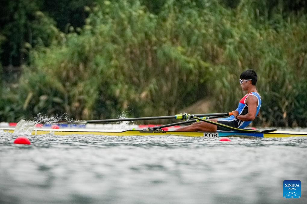 Kim Jongmin of South Korea competes during the Men's Single Sculls Repechage of rowing at the 19th Asian Games in Hangzhou, east China's Zhejiang Province, Sept. 21, 2023. (Xinhua/Jiang Han)