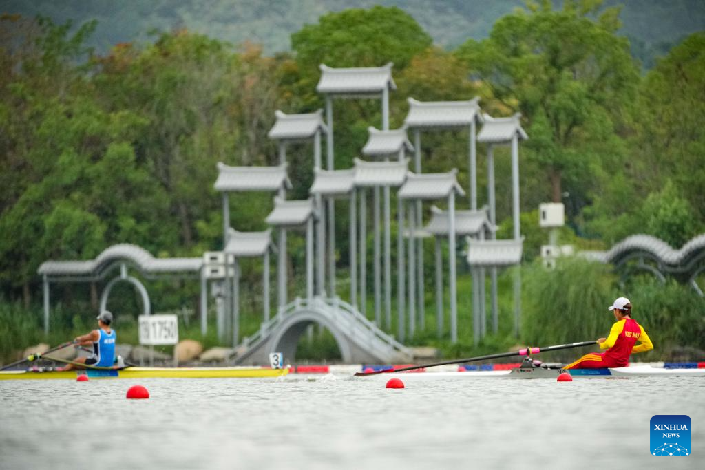 Ho Thi Duy (R) of Vietnam and Chae Sehyeon of South Korea compete during the Women's Single Sculls Repechage of rowing at the 19th Asian Games in Hangzhou, east China's Zhejiang Province, Sept. 21, 2023. (Xinhua/Jiang Han)