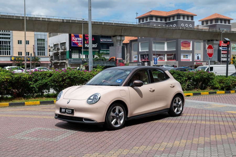 A customer takes a test drive of an Ora Good Cat electric vehicle, a model of Chinese car maker Great Wall Motor (GWM), in Kuala Lumpur, Malaysia, Feb. 17, 2023. (Photo by Chong Voon Chung/Xinhua)