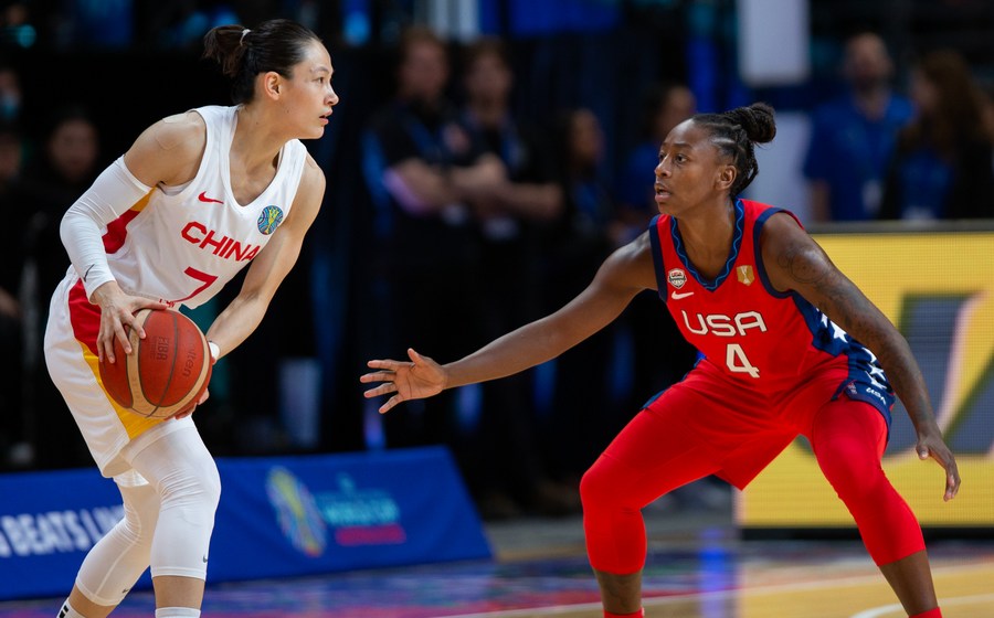 Yang Liwei (L) of China vies with Jewell Loyd of the United States during the final at the FIBA Women's Basketball World Cup 2022 in Sydney, Australia, Oct. 1, 2022. (Photo by Hu Jingchen/Xinhua)