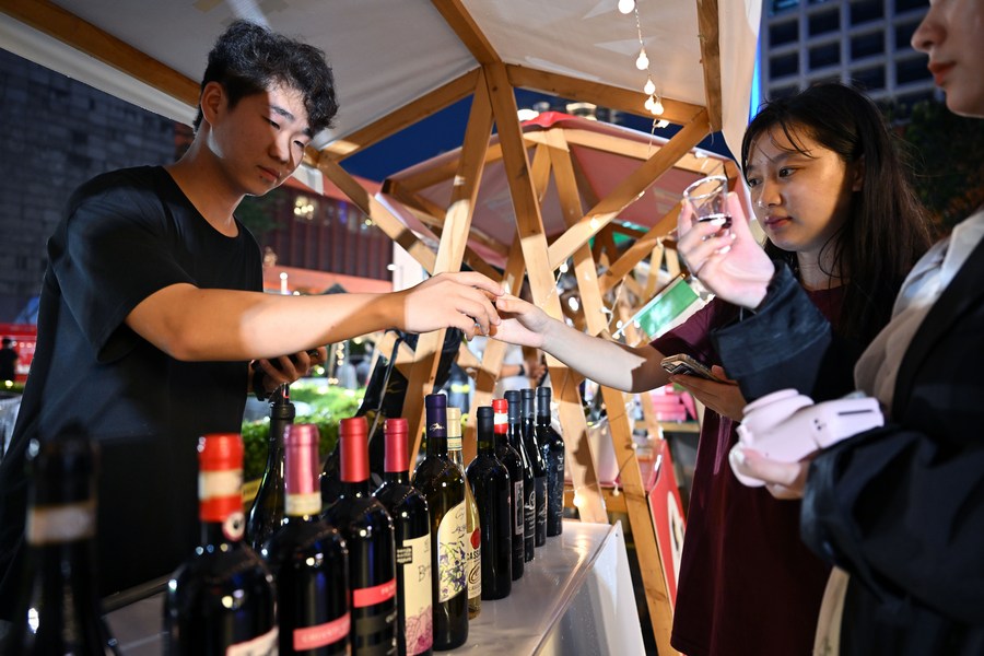 Visitors taste Italian wine at the Italy Day event in Haikou, capital of south China's Hainan Province, Sept. 15, 2023. (Xinhua/Guo Cheng)